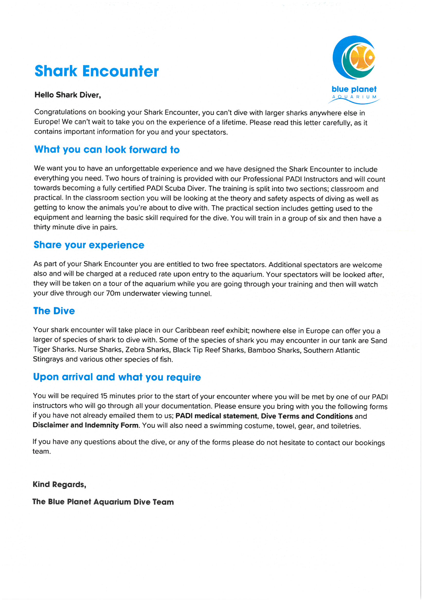 “I Dived with the Sharks at Blue Planet Aquarium” Certificate.